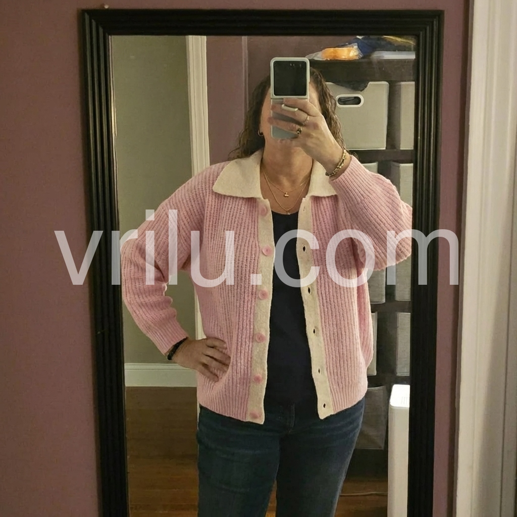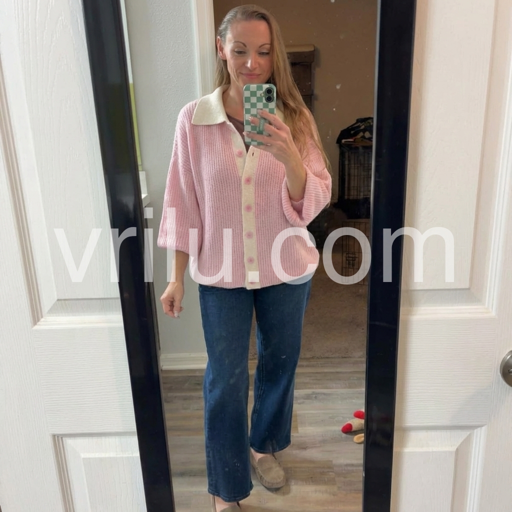 This sweet pink collared long sleeve cardigan is the perfect addition to any wardrobe. Made from high-quality materials, it offers both comfort and style. Its versatile design allows for easy pairing with any outfit, making it a must-have for any fashion enthusiast. Embrace comfort and sophistication with this cozy sweater.