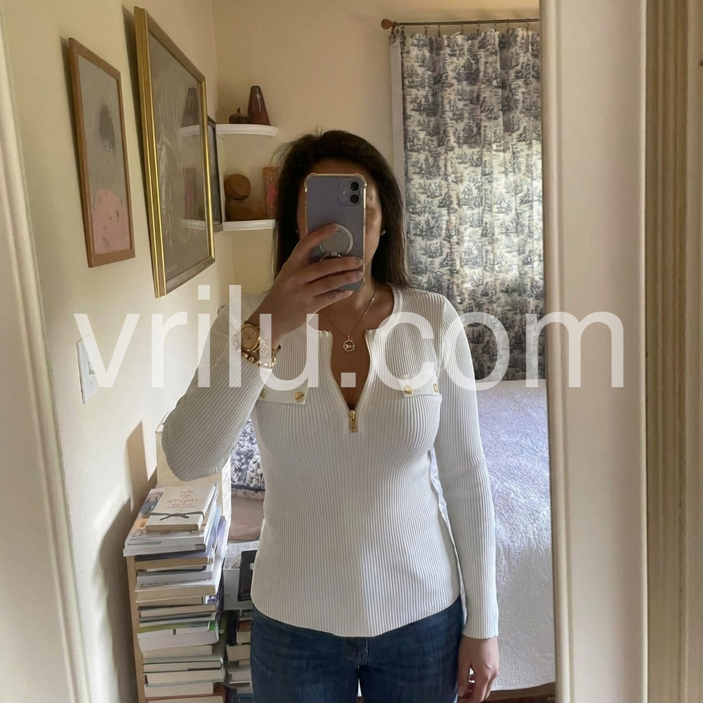 Chic Zip V-Neck White Plain Knit Top