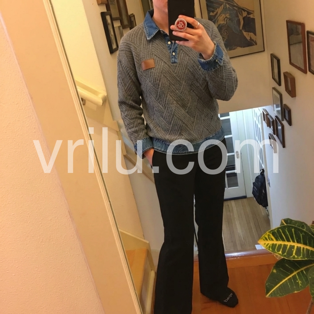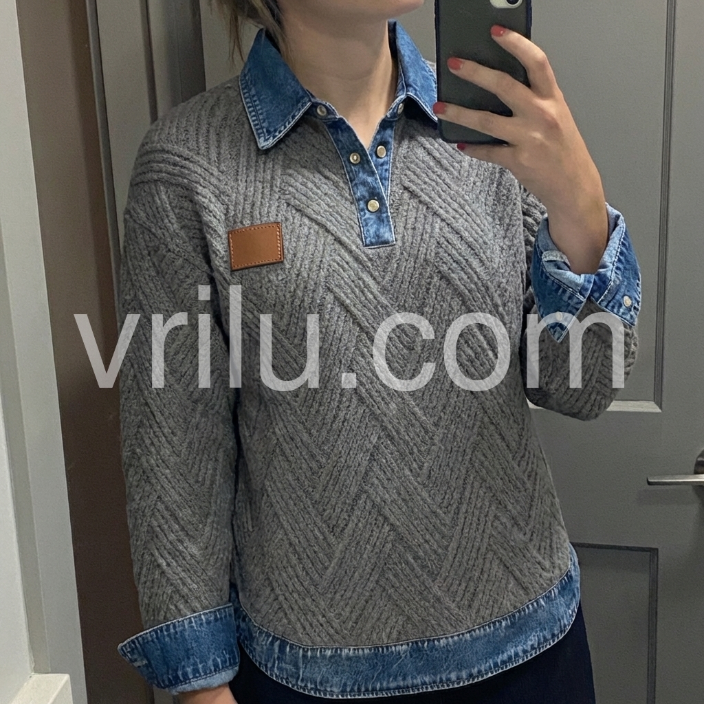Elevate your casual wardrobe with this sophisticated grey herringbone knit sweater, featuring a distinctive denim collar that bridges the gap between refined knitwear and relaxed styling. The herringbone texture adds visual depth and dimension, while the contrasting denim collar provides a contemporary edge perfect for layering or wearing standalone. Crafted for versatility, this piece transitions seamlessly from weekend wear to smart-casual settings, offering both comfort and polished appeal.