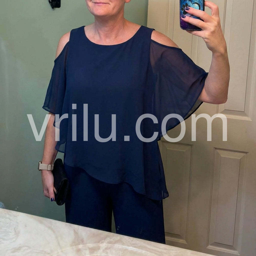 This fashionable two-piece set includes a navy cold shoulder three-quarter length draped sleeves and asymmetrically layered ruffled top and pants. Crafted from lightweight and soft materials, this set is perfect for any occasion. Step up your look with this stylish set.