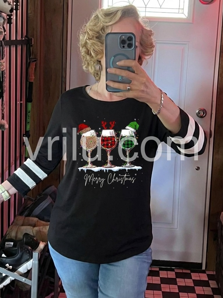 Stunning Print 3/4 Sleeve Round Neck Black Top