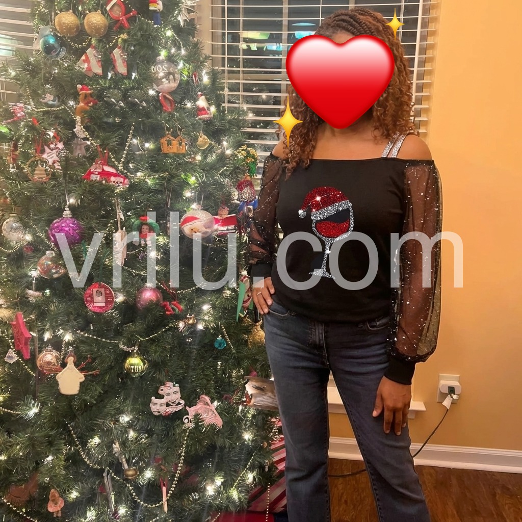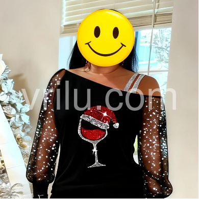 This elegant long-sleeved holiday Christmas shirt features a glittering print of a tipsy red wine glass with a Santa Claus hat, spreading the holiday cheer with a super-fun vibe, ready for par-tay good times! This black off-shoulder asymmetrical shirt features sheer long sleeves elevating this top to a luxe look for any date night. Machine wash cold tumble dry low to medium heat. Iron if needed or lay flat to dry.