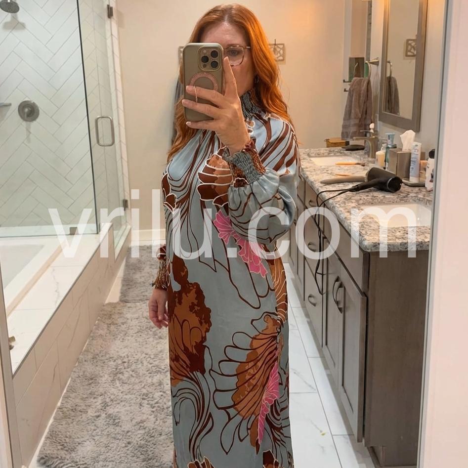 As a product expert, I present to you this Popular Long Sleeve Print Maxi Dress. Made of lightweight, breathable fabric, this dress is perfect for any occasion. With its elegant long sleeves and flattering print design, you'll feel confident and stylish all day long.