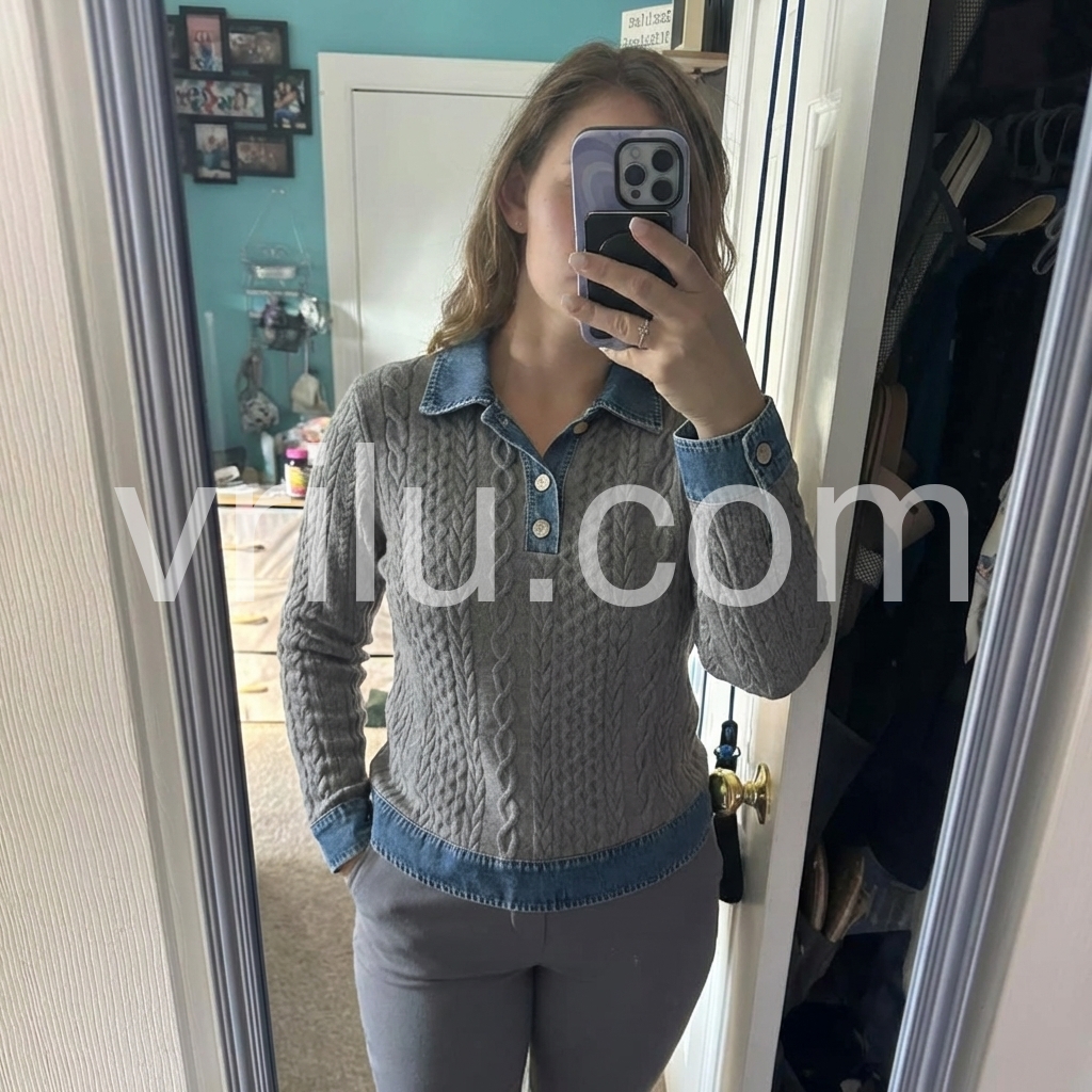 Elevate your casual wardrobe with this sophisticated grey cable knit sweater, featuring a distinctive denim collar that bridges classic and contemporary style. The intricate cable pattern adds textural depth and visual interest, while the long sleeves provide warmth and versatility for layering. Crafted with attention to detail, this piece transitions seamlessly from weekend wear to smart-casual settings, offering the comfort of premium knitwear with refined aesthetic appeal.